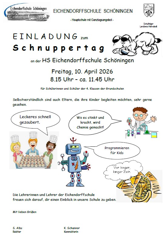 Wir laden Ihr Kind am Freitag, 10. April 2026, ein, an unserem Schnuppertag unsere Schule kennenzulernen.