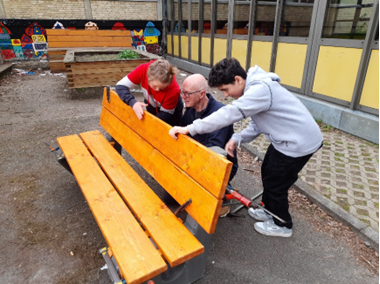 Auch für den eigenen Schulhof fühlt sich die Praxisklasse verantwortlich. Altersschwache oder durch Vandalismus zerstörte Bänke werden repariert.