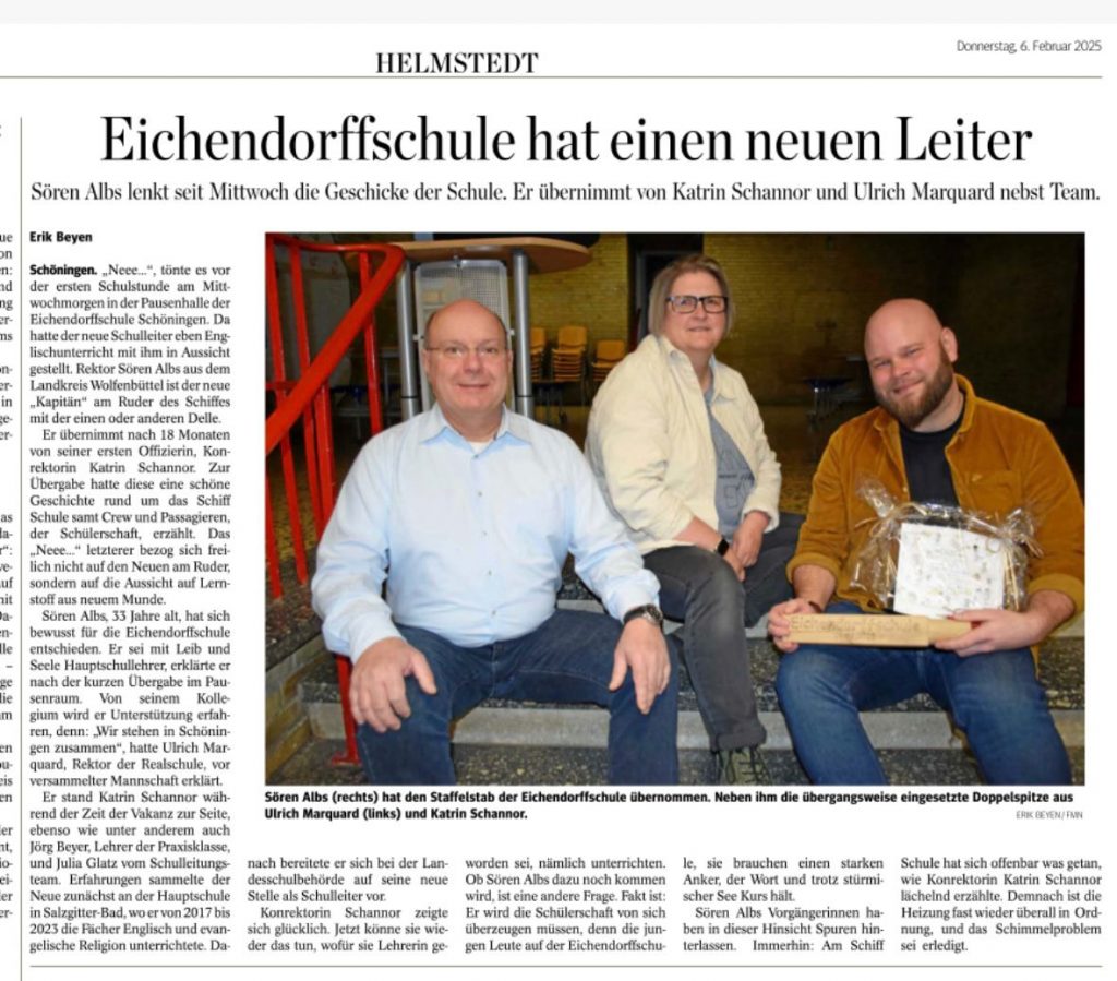 Mein Name ist Sören Albs und seit dem 05.02.2025 bin ich nun Schulleiter der Eichendorffschule. Nach sechs Berufsjahren als Lehrer an der Dr.-Klaus-Schmidt-Hauptschule in Salzgitter-Bad zog es mich vor anderthalb Jahren in das Regionale Landesamt für Schule und Bildung, wo ich als schulfachlicher Mitarbeiter die Schulverwaltung genauer kennenlernen durfte.