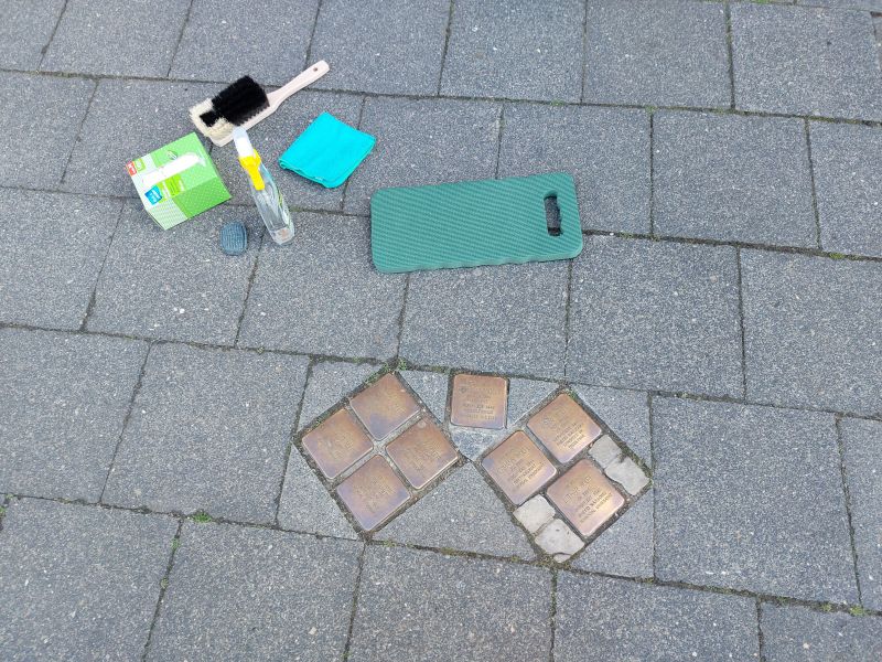 Herr und Frau Saak übergaben einen Rucksack mit Putzutensilien. Zu der Patenschaft gehört es, die Stolpersteine zu reinigen und somit nicht nur die Steine, sondern auch die Erinnerung aufzupolieren.