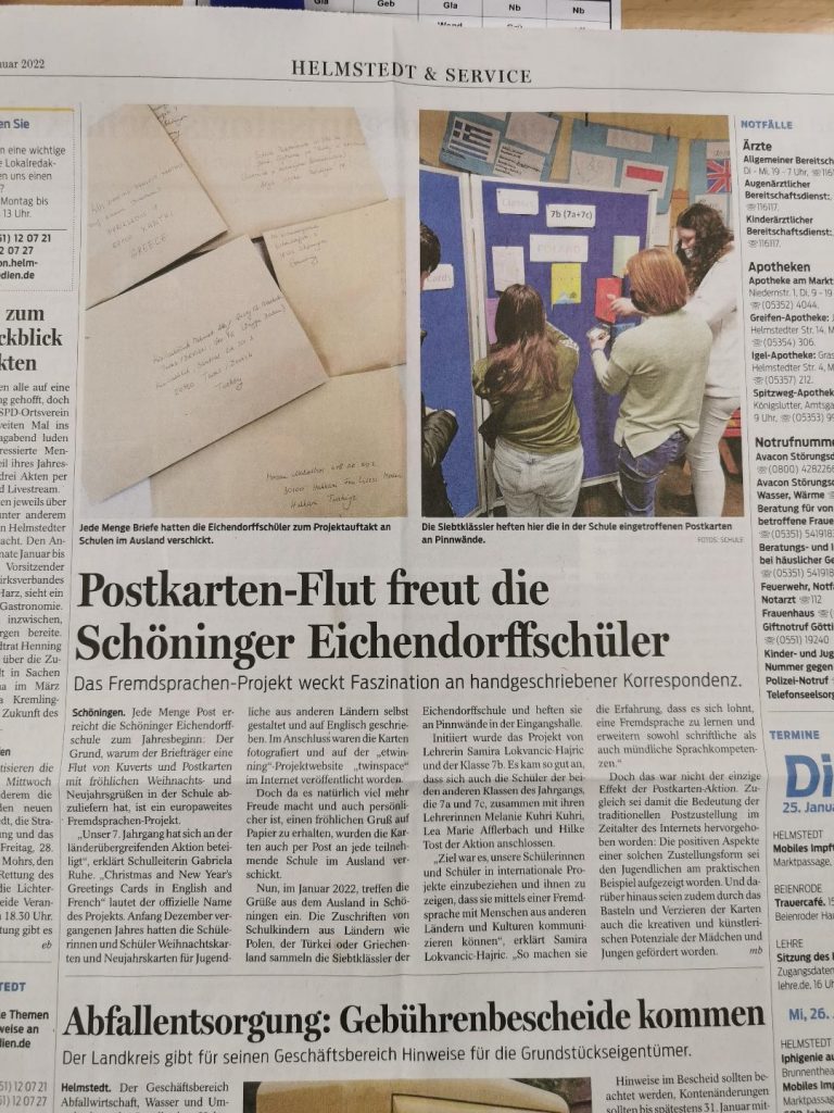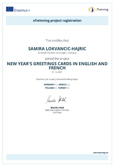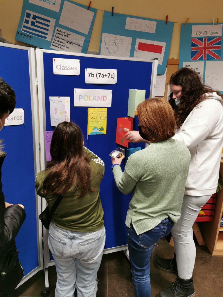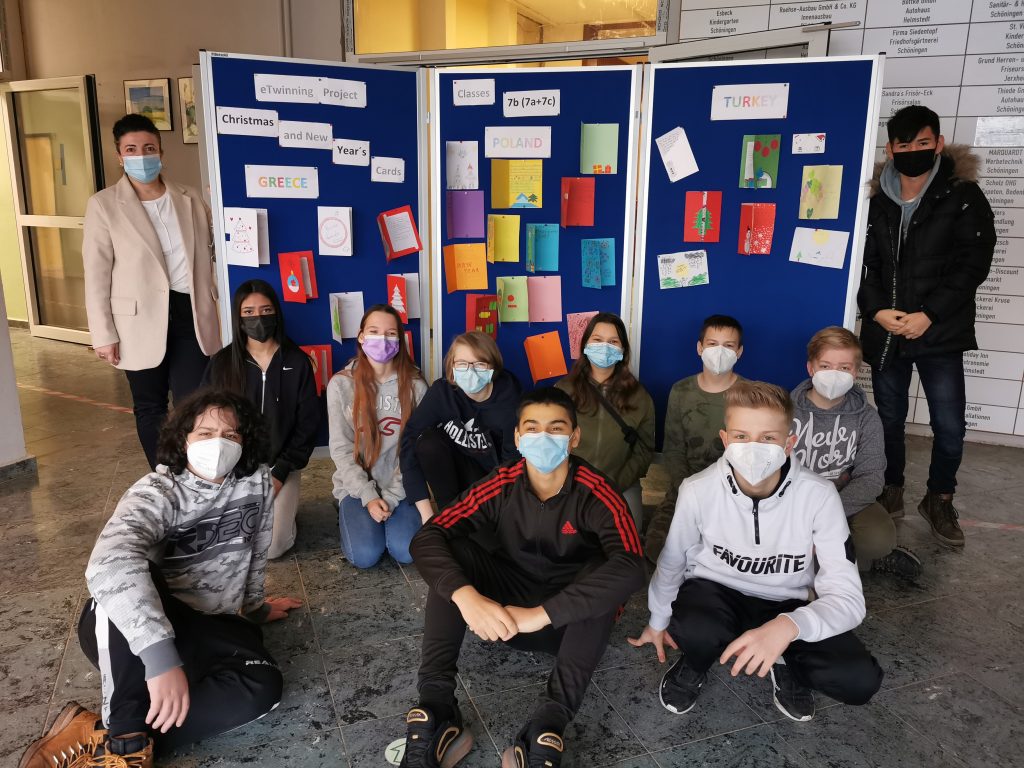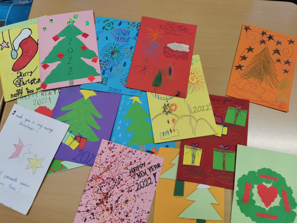 Anfang Dezember 2021 werden die Schülerinnen und Schüler Weihnachtskarten und Neujahrskarten für Schülerinnen und Schüler aus anderen Ländern selber gestalten und auf Englisch bzw. Französisch schreiben. Die Karten werden fotografiert, um die Bilder auf die etwinning-Projektwebsite twinspace hochladen zu können und per E-Mail an die Lehrer aus teilnehmenden Ländern vor den Weihnachtsferien zu verschicken. Anschließend werden sie per Post an jede Anfang Dezember 2021 haben die Schülerinnen und Schüler Weihnachtskarten und Neujahrskarten für Schülerinnen und Schüler aus anderen Ländern selber gestaltet und auf Englisch geschrieben. Die Karten wurden fotografiert und auf die etwinning-Projektwebsite twinspace veröffentlicht. Anschließend wurden sie per Post an jede teilnehmende Schule im Ausland verschickt. Im Januar 2022 haben die Schüler Karten aus dem Ausland erhalten und sich sehr darüber gefreut. Das Projekt wurde initiiert durch Frau Lokvancic-Hajric und Klasse 7b. Das Projekt kam sehr positiv an in den anderen beiden Klassen der Jahrgang 7, Klassen 7a und 7c, und die SchülerInnen beteiligten sich, zusammen mit Frau Kuhri, Frau Afflerbach und Frau Tost an diesem Projekt.