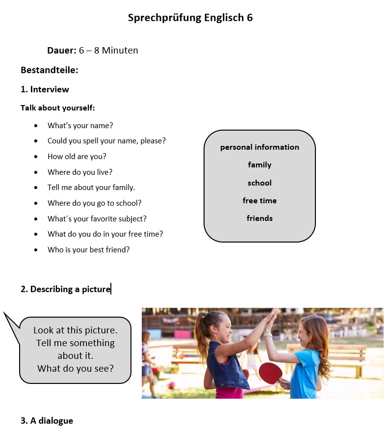 In den Jahrgängen 6, 8 und 10 wird jeweils eine schriftliche Lernkontrolle durch eine Sprechprüfung ersetzt. Die Sprechprüfung besteht aus drei Teilen.